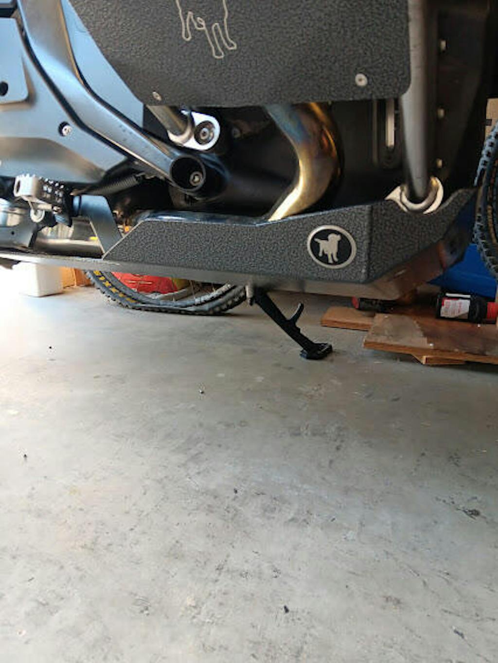 Another important design requirement is that it must be easily removable for maintenance. Just 4 identical bolts to remove the skid plate from the mounting system. For this model especially, leaving the skid plate on the bike for oil and filter changes is just not an option as it will create a HUGE mess and create the risk of getting oil on your rear tire which as obviously very hazardous.